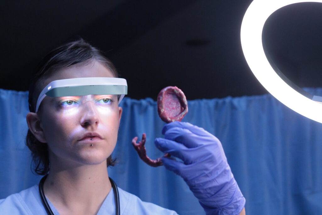 So my questions are: why have you chosen a laboratory setting? Were you inspired by those Renaissance paintings? And finally, since modern science is deeply responsible for a fragmented understanding of the body: in your performance, you search for fragments (microplastics) using a visual device tied to modern medicine. What idea of the body do you want to communicate through this work?