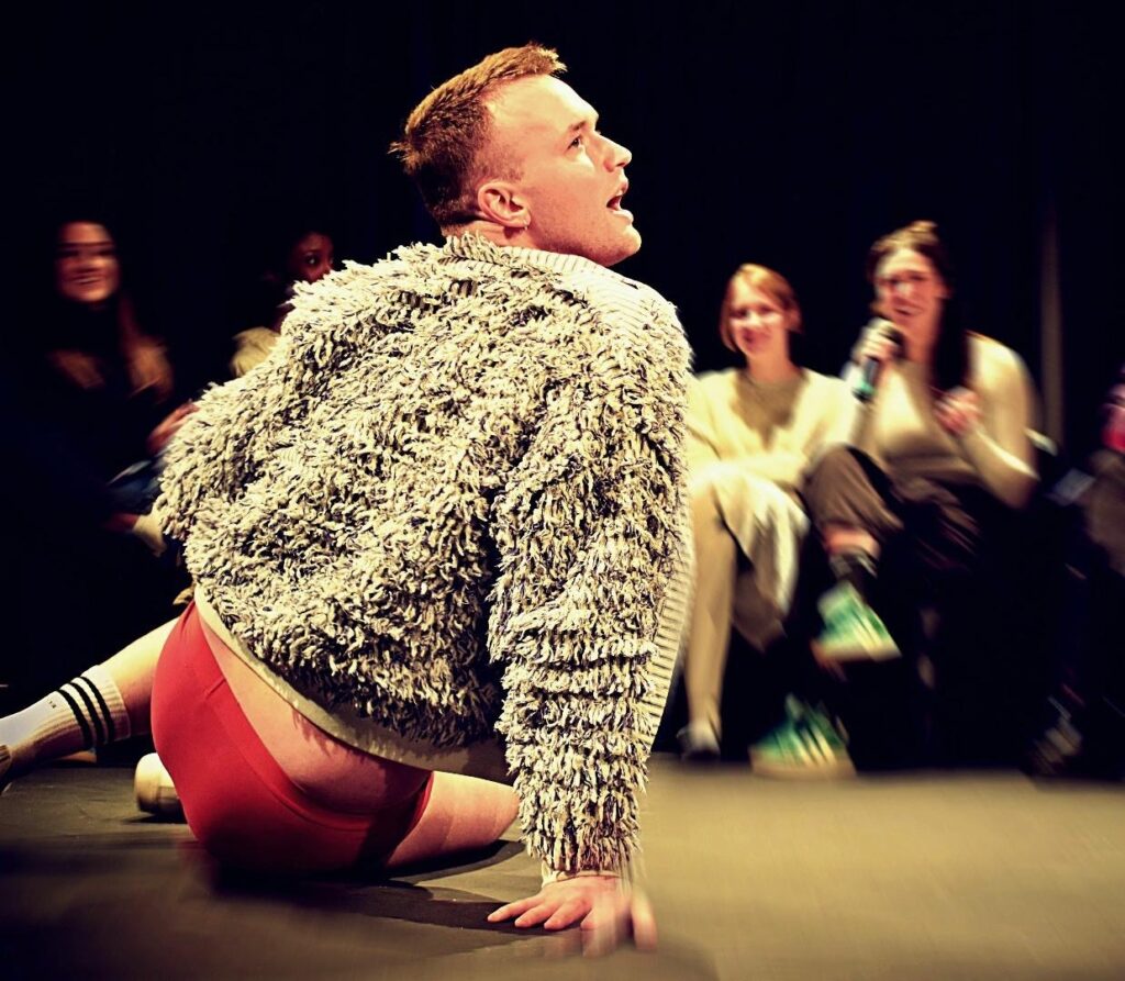 Lizzy Tan’s text on Sam Burkett’s show GOSS shapeshifts and experiments with form just as much as its subject does. Sam’s piece is defined by taking risks and venturing into the unknown — into unexpected depths. It is no linear show that the audience simply watches. Instead, they are watched by Sam, as Sam serves up observations that reveal tragicomic truths about us — about society. Tan writes in Sam’s rhythm — quick, sharp, alive — finding philosophy in the pauses, wit in precision. The form of her text keeps shifting, carrying a pulse as vibrant and restless as GOSS itself.